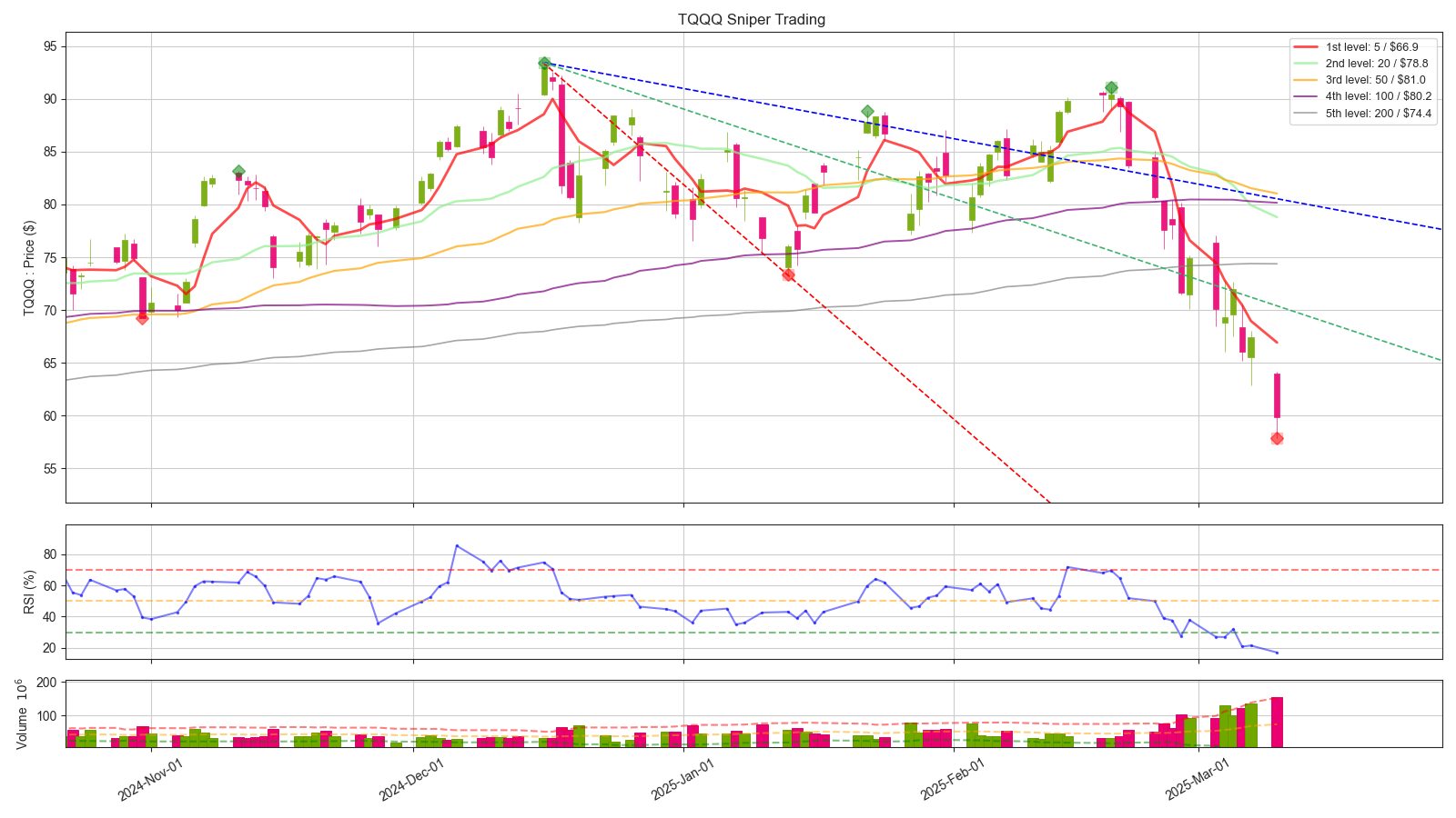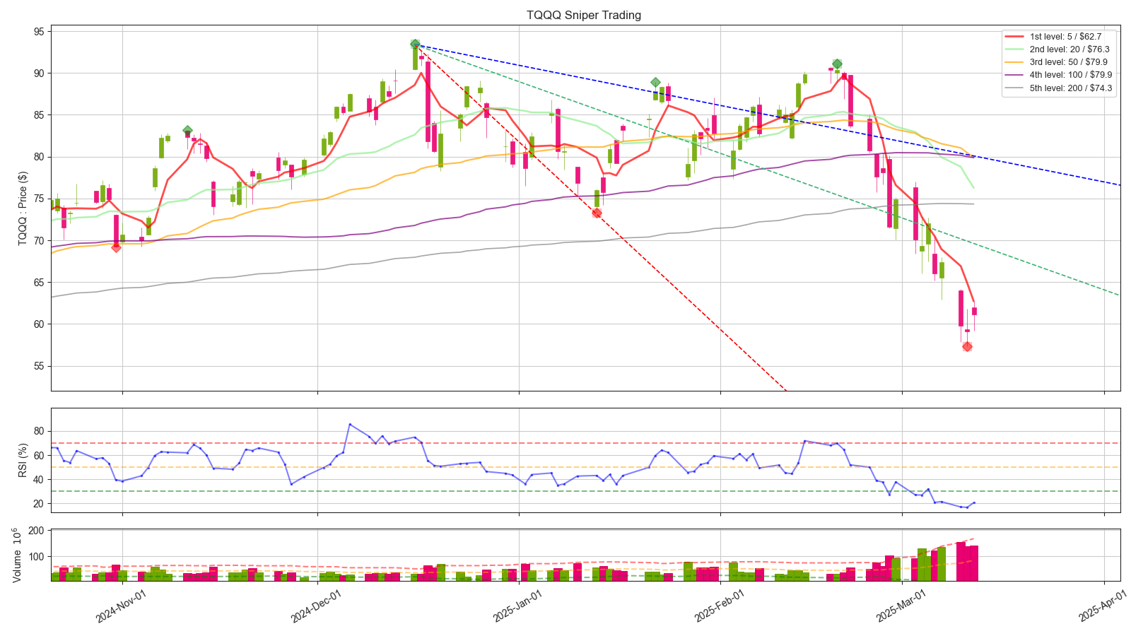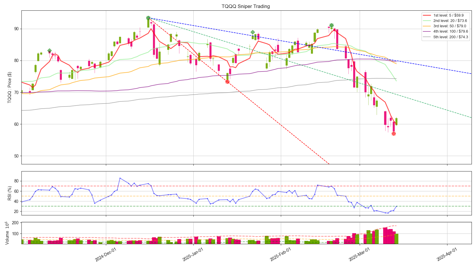- 3배 레버리지 기준으로 손절가 이미 이탈했습니다. 본인의 원칙에 부합하지 않는다면, 손절도 고려하셔야 합니다. 저는 원지수까지 같이 보고 있고, 또한 거시경제 관점에서도 보고 있는데 이게 이렇게 빠지는게 사실 말이 안되서, 손실 감안하더라도 홀드 들어가려고 합니다. 단기적인 관점에서 빠르게 $70불 까지는 빠르게 회복을 해야 다음을 기약할 수 있습니다.